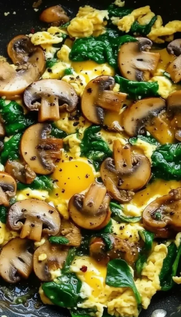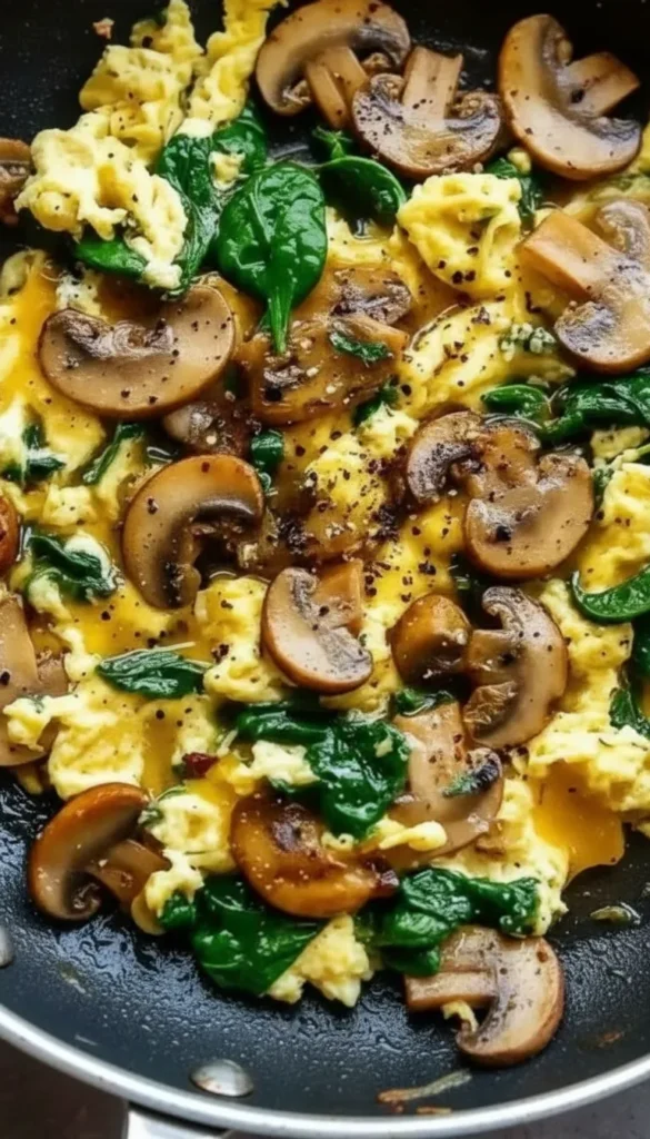 How to prepare protein-rich mushroom spinach scrambled eggs in just minutes using simple ingredients for a hearty and satisfying breakfast.