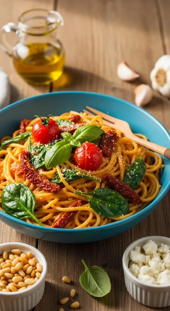 So you want something creamy, comforting, and slightly fancy but you also don’t want to spend your entire evening chained to the stove? Same. This spaghetti with spinach and sun-dried tomato cream sauce is what happens when “I should eat something green” meets “but I also want carbs.”