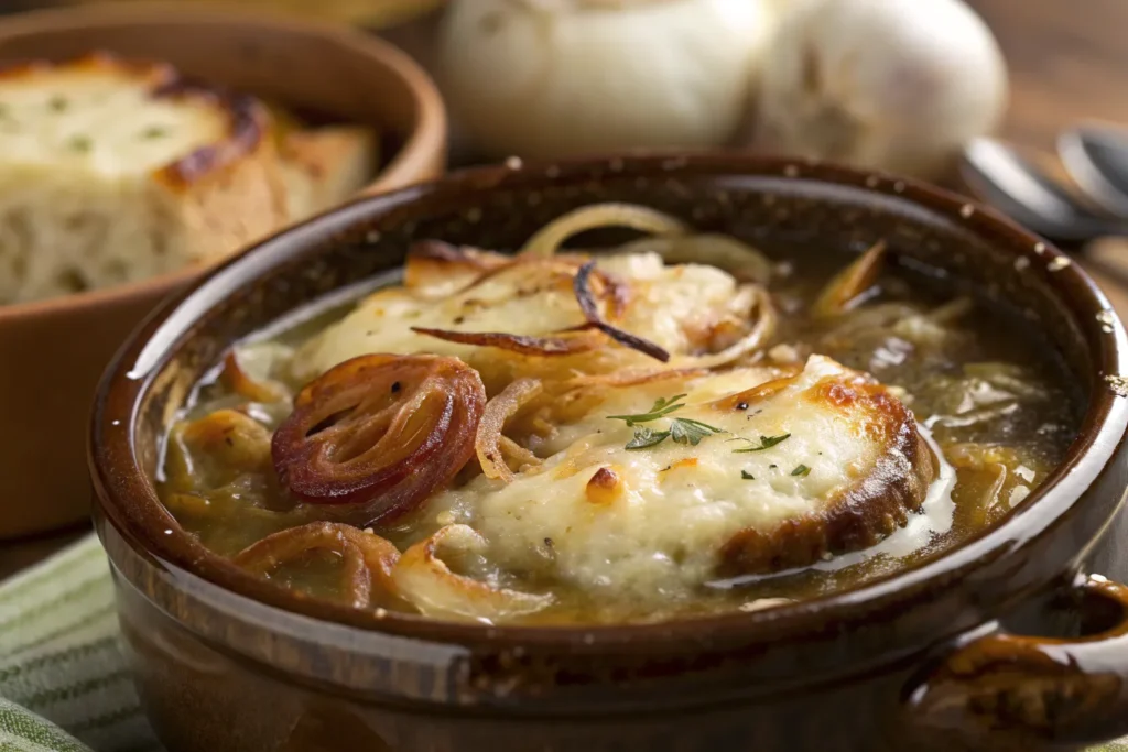 Nutritional values may vary by ingredients used, but the soup is generally low in fat and calories. Onions provide fiber and antioxidants, while broth adds protein. Cheese and bread increase richness, making the dish filling and well-balanced.