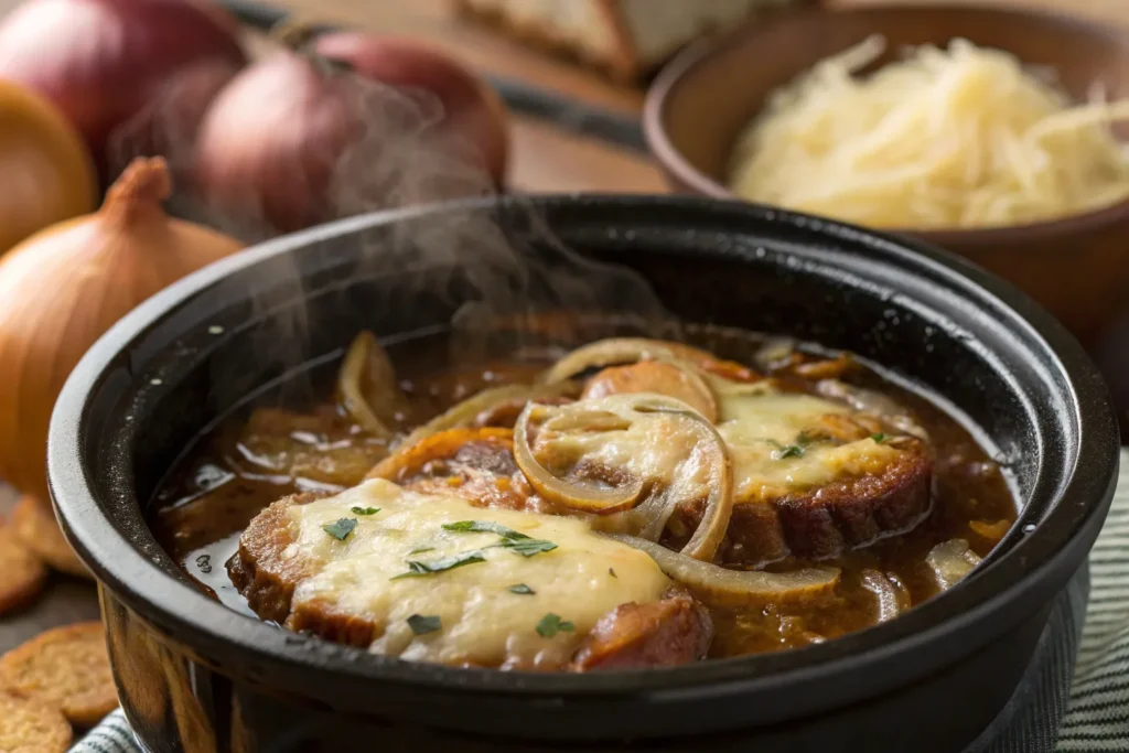 Making French onion soup in the crockpot eliminates the need for constant stirring and monitoring. The slow heat caramelizes the onions beautifully, creating a naturally sweet, rich base. It is simple, cost-effective, perfect for gatherings, and pairs well with salads, roasted meats, or crusty bread.