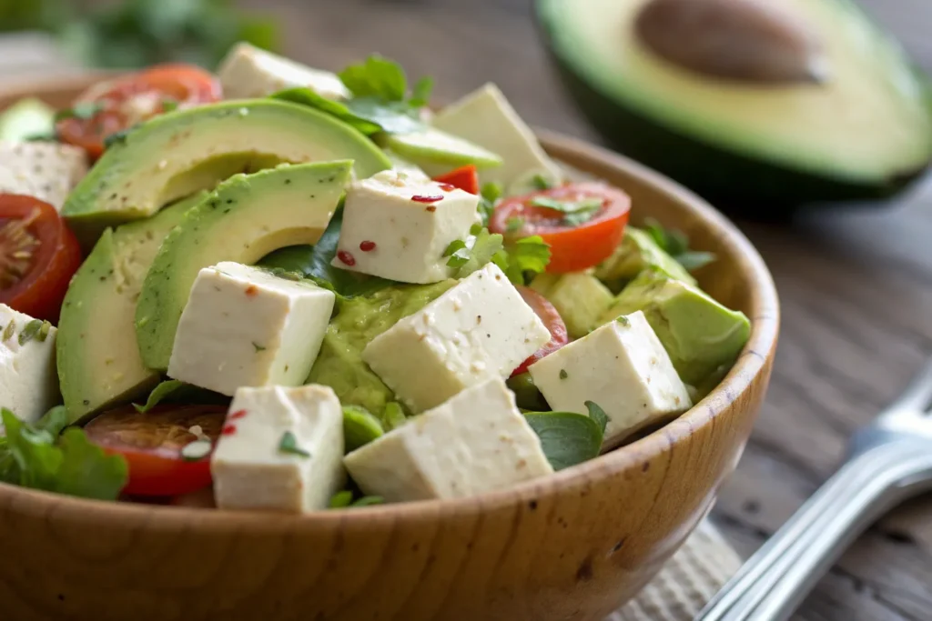 Tofu provides a complete plant-based protein source and contains calcium and iron. Avocado adds heart-healthy monounsaturated fats, fiber, and potassium. Combined with fresh vegetables, this salad is low in calories but high in nutrients, making it ideal for a balanced meal.