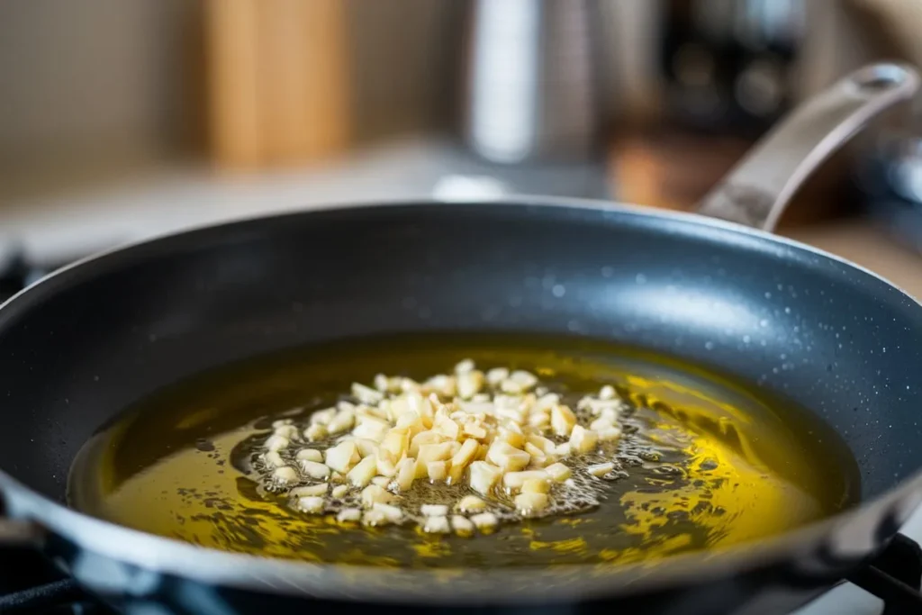 • Gently cook until fragrant without letting the garlic brown.