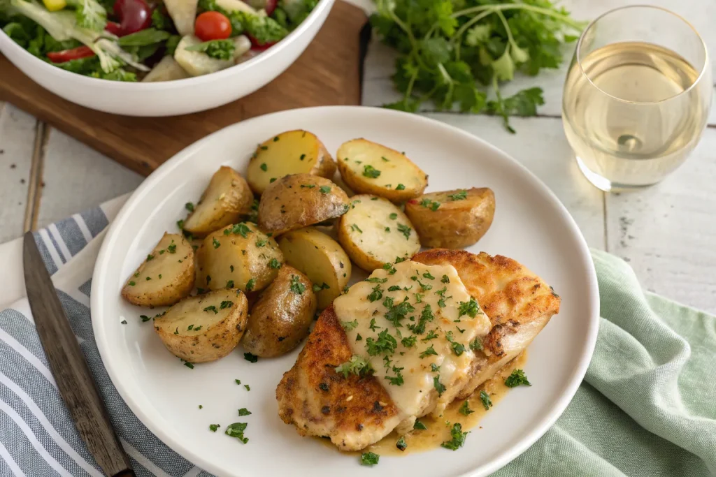 - A light vinaigrette on the side complements the richness of the chicken and potatoes.