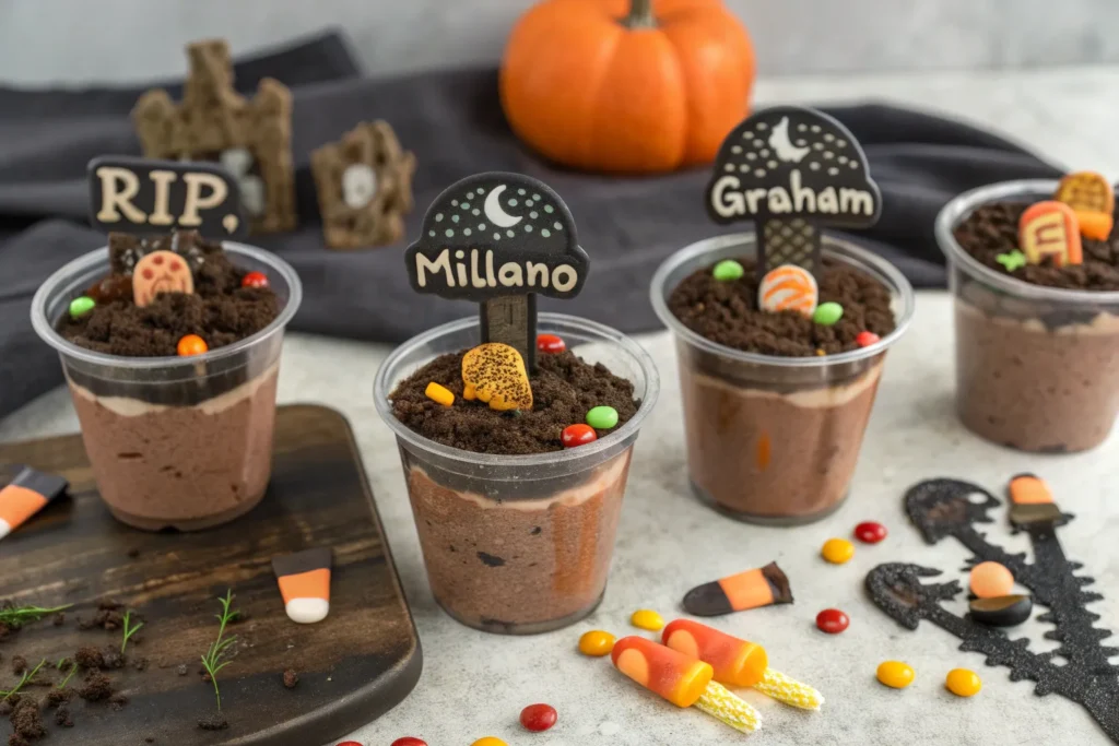 For a premium spooky effect, add a thin layer of chocolate ganache under the cookie “dirt” to create depth. Use matcha-dyed coconut flakes to mimic moss on gravestones. You can also pipe small chocolate trees or ghosts to elevate your edible graveyard landscape.