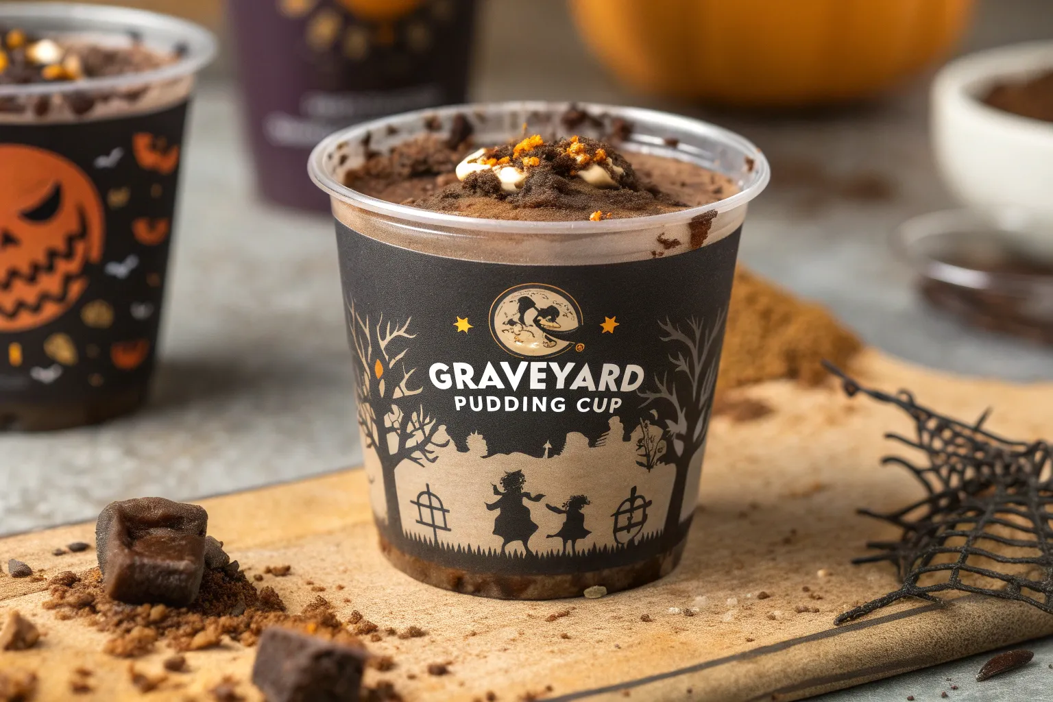 Serve these pudding cups on a black tray with faux spiderwebs, toy spiders, or mini LED candles for ultimate spooky effect. Add name tags for a themed party or personalize gravestones with humorous inscriptions. These cups also pair well with other Halloween treats like witch hat cones, pumpkin patch brownies, or monster rice krispies.