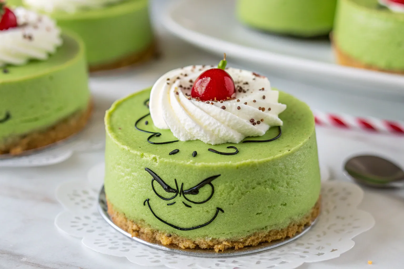 Mini cheesecakes originated as an American variation of the traditional cheesecake, designed for individual servings. Over the years, themed mini desserts have become popular during holidays, offering both convenience and visual appeal. The Grinch-themed version draws inspiration from Dr. Seuss’s iconic character, combining holiday whimsy with classic dessert flavors.
