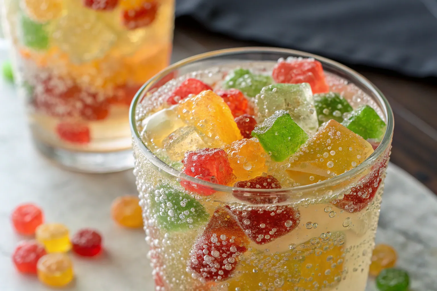 Place ice cubes into a tall glass. Add the fruit juice over the ice, then pour sparkling soda slowly to retain the fizz. Drop in a handful of gummy bears, allowing them to float and mix with the drink. Garnish with fresh fruit slices or mint leaves for a festive presentation. Serve immediately with a straw or cocktail stirrer, letting the gummy bears add a fun, chewy surprise with each sip.