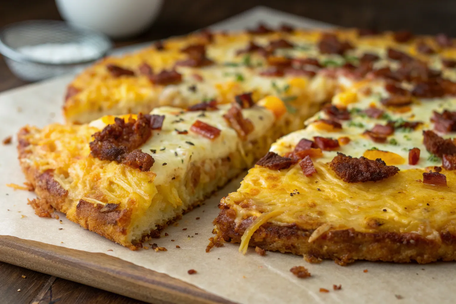 The crust is crispy and golden, while the inside stays tender and cheesy. Toppings add savory depth, richness, and freshness. Every bite delivers comforting breakfast flavors with a pizza-style twist.