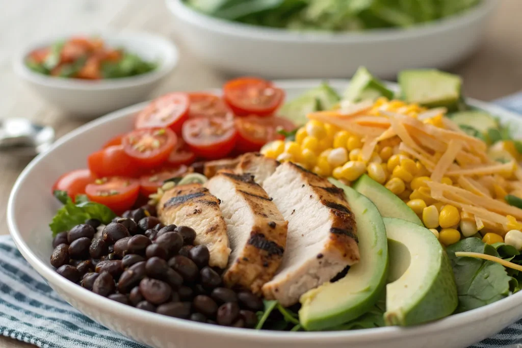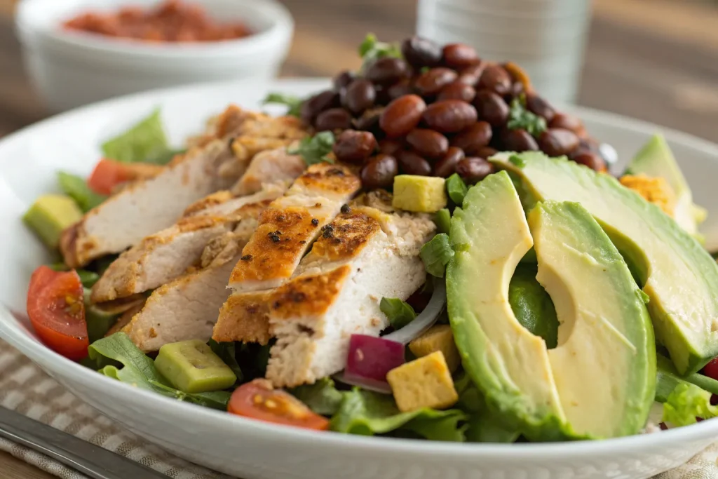 Fresh, flavorful ingredients are key to this salad. With chicken, beans, corn, avocado, cheese, and vibrant veggies, it’s packed with protein, fiber, and healthy fats. Each component adds texture, color, and taste, making every bite exciting and satisfying.