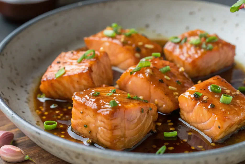 - Add Sauce: Pour the honey garlic sauce over the salmon bites and toss gently. Cook for an additional 2 minutes until the sauce thickens and coats the salmon.