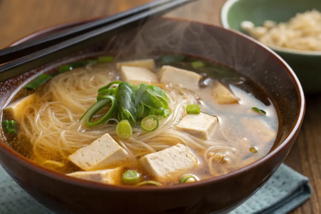 Glass noodles are naturally gluten-free and low in fat. The broth provides hydration and minerals, while added vegetables contribute fiber and vitamins. When paired with tofu, eggs or seafood, this soup becomes a balanced, nourishing meal without excess calories.