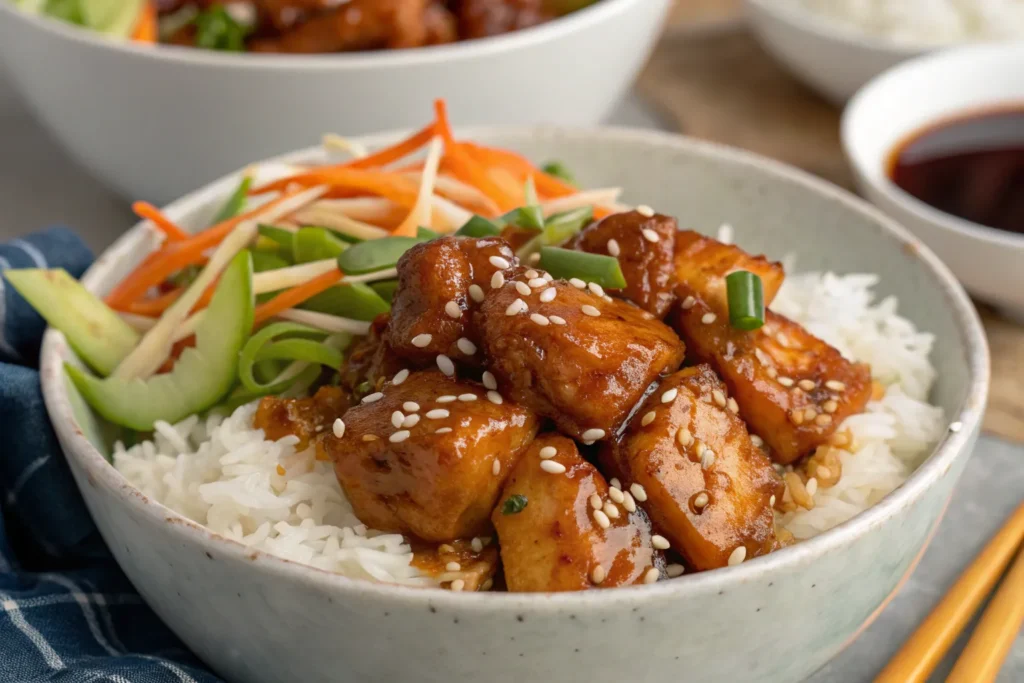 These sticky chicken bowls hit every note: sweet, salty, tangy, and savory. The chicken is tender and juicy, coated in a thick, glossy sauce that clings perfectly to each piece. Paired with fluffy rice and crisp vegetables, the contrast in textures makes every bite exciting and satisfying.