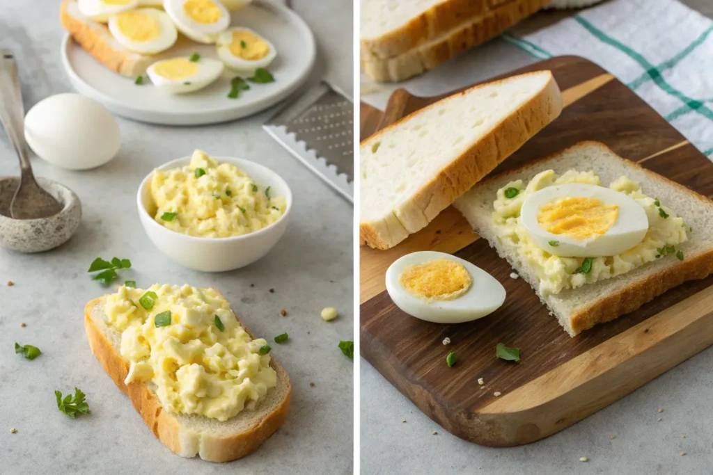 - Spread the egg filling evenly across two slices of bread.