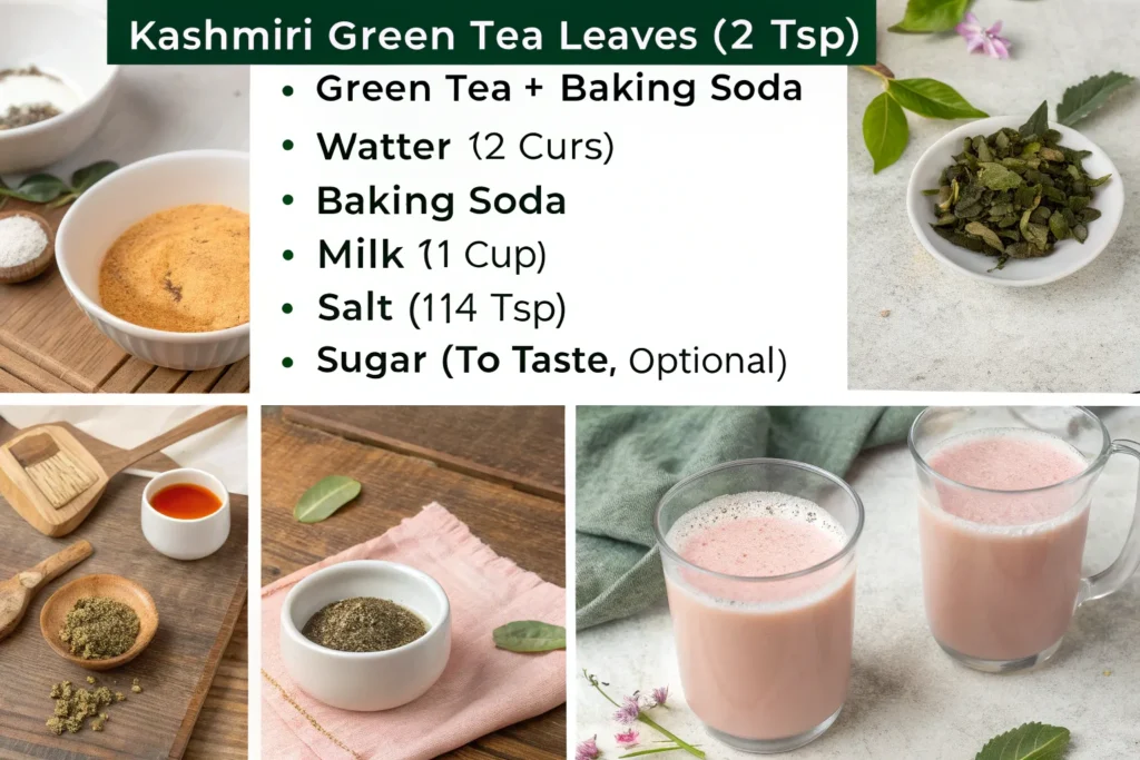 • Kashmiri green tea leaves (2 tsp) or green tea + baking soda: Traditionally, special pink tea leaves are used, but strong green tea works with baking soda.