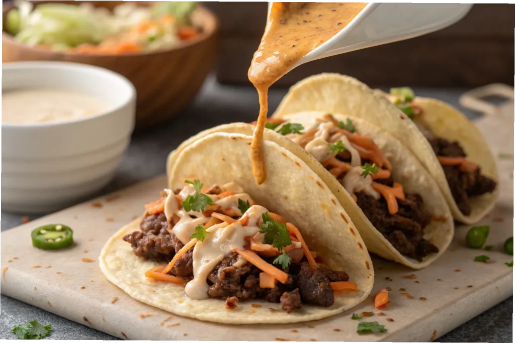 5. Assemble Tacos – Layer beef, slaw, drizzle with spicy mayo, and garnish with cilantro, onions, and lime.