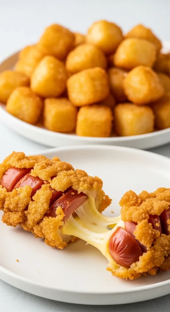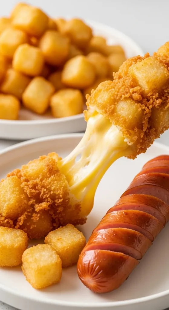 Dip each hot dog and cheese skewer into the batter. Roll it in the diced potatoes first, pressing gently so they stick. Then roll it lightly in panko breadcrumbs for extra crunch. Yes, this step gets messy. That’s part of the experience.