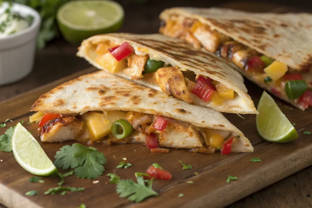 Place chicken and cheese on a tortilla, add veggies if desired, then top with another tortilla. Cook on a skillet until golden and cheese melts. Serve with sour cream.