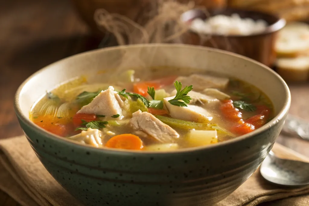 Leftover chicken makes a delicious addition to homemade chicken soup. Simmer shredded chicken in a flavorful broth with noodles, vegetables, and fresh herbs for a warm and comforting meal. Add garlic, onion, or a squeeze of lemon for extra depth. This soup is perfect for cozy nights, and it also freezes well for future meals.