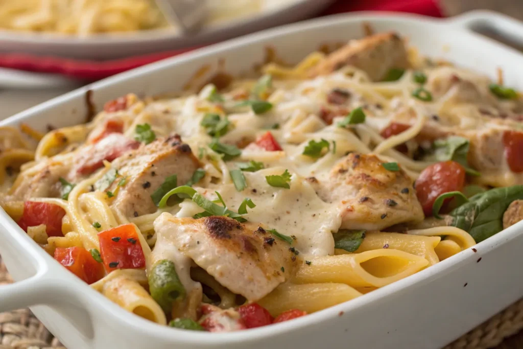 Chicken pasta bake is a hearty and comforting way to use leftover chicken. Combine shredded chicken with cooked pasta, marinara or Alfredo sauce, and cheese, then bake until the top is golden and bubbly. This dish is perfect for feeding a family or making ahead for easy weeknight dinners, and you can add vegetables like spinach, mushrooms, or bell peppers for extra nutrition.