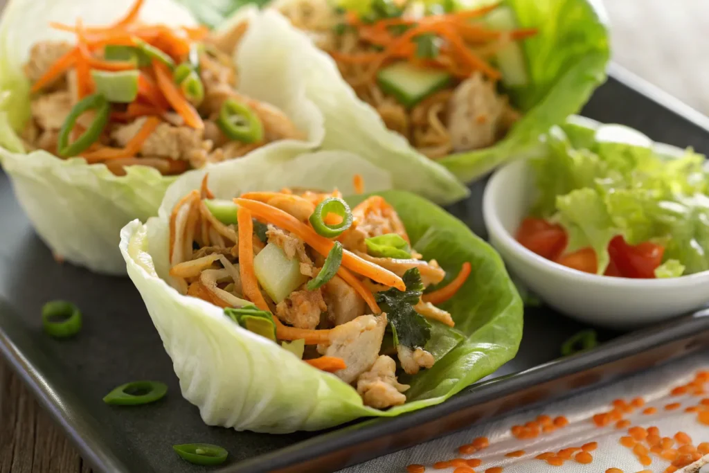 Ground or shredded chicken sautéed with soy sauce, garlic, and ginger, then spooned into crisp lettuce leaves. Top with shredded carrots and sesame seeds for a crunchy, flavorful bite.