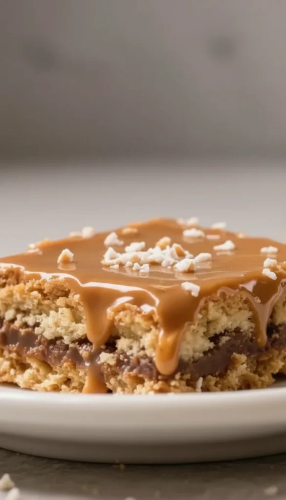 • Two-layer method: Pressing in half the dough, adding caramel, then crumbling on the rest keeps the bars neat and structured.