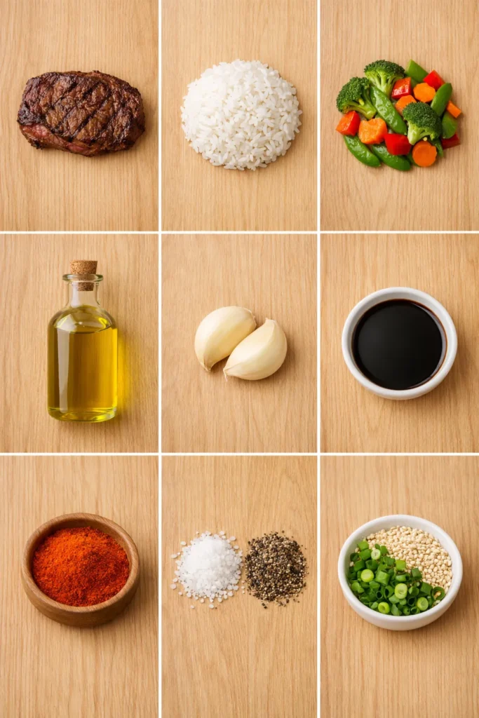 - Assemble your bowl. Rice on the bottom, steak strips on top, veggies on the side. Sprinkle optional toppings like green onions, sesame seeds, or a drizzle of sriracha. Boom your masterpiece.