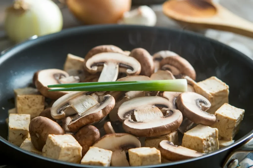 Pressing the tofu is essential to achieving a crisp exterior and preventing it from breaking during cooking. Using a hot pan ensures the mushrooms brown instead of steaming. Avoid overcrowding the pan to keep the stir-fry flavorful and properly seared.