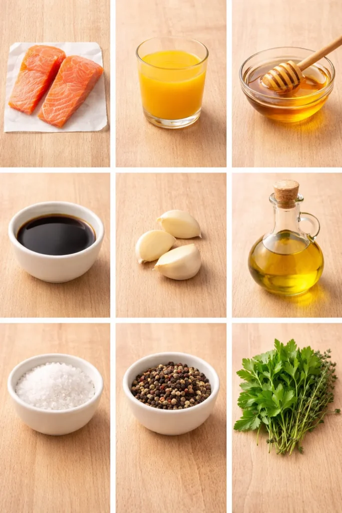- Mix the glaze – Whisk together orange juice, honey, soy sauce, and minced garlic in a small bowl. Done. Easy.