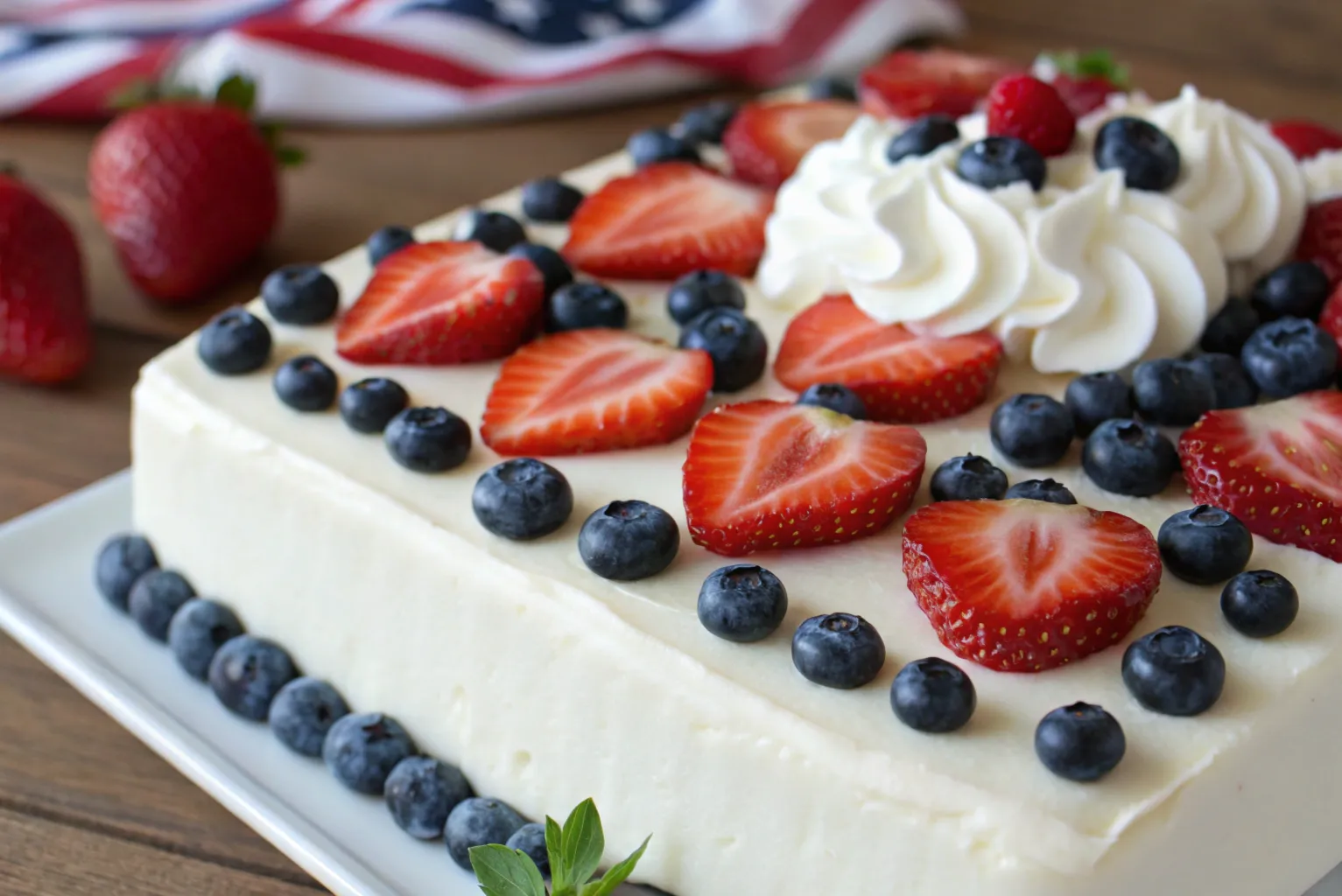 You can use food coloring in the batter or add layers of colored gelatin or fruit toppings to create the patriotic red, white, and blue effect.