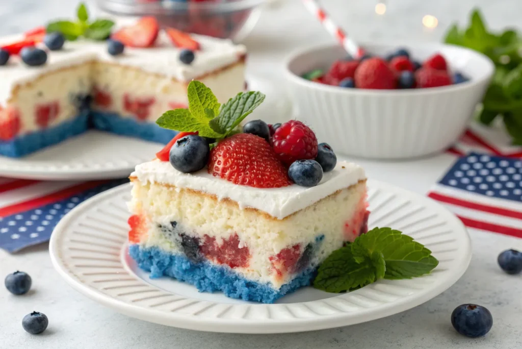 Patriotic Poke Cake is more than just a dessert — it’s a showstopper that adds excitement and sweetness to any celebration. With its colorful layers, light texture, and easy preparation, it’s the perfect recipe to make when you want something festive without spending hours in the kitchen. So gather your ingredients, get baking, and watch your guests’ faces light up when you slice into this red, white, and blue beauty.