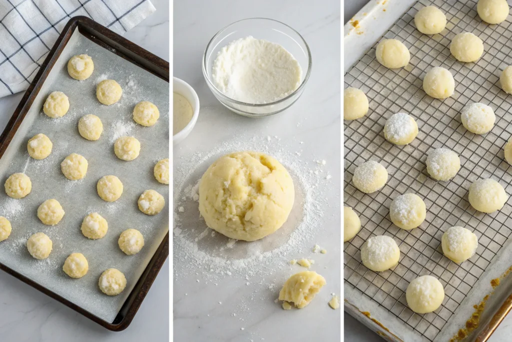 Making these cookies is simple and beginner-friendly. Start by creaming the butter and powdered sugar until light and fluffy, this step helps with the meltaway texture. Add the vanilla and peppermint extracts, then gradually mix in the flour, cornstarch, and salt to create a soft dough. The dough should chill for a short time to firm up and make it easier to handle.