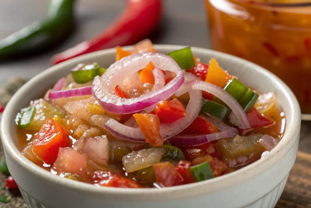 This relish is a perfect balance of sweet, tangy, and slightly spicy flavors. It’s easy to make, requires simple ingredients, and adds an instant flavor boost to a variety of dishes. The pickling process enhances the natural crunch of the peppers and onions, creating a versatile topping that keeps well in the fridge.