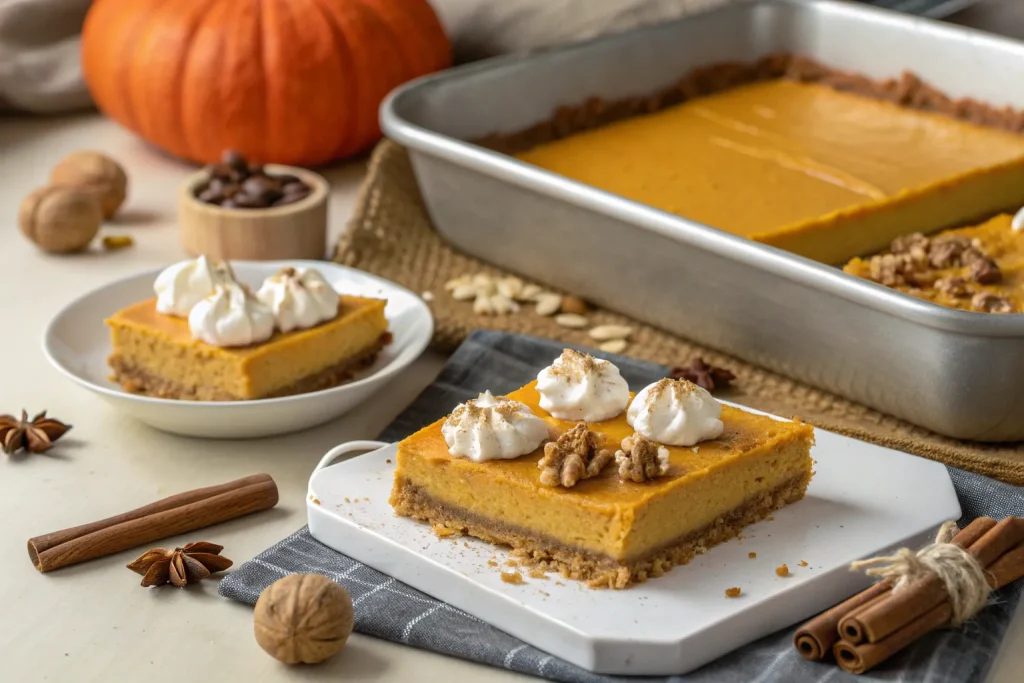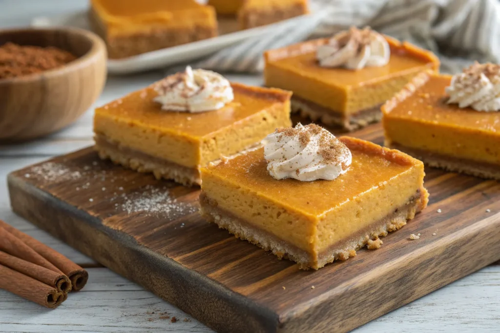 Pumpkin pie bars are versatile enough to shine at any occasion. They can be dressed up with whipped cream and caramel for holidays, or enjoyed plain as a cozy weekday dessert. However you serve them, they’ll always feel festive and comforting.