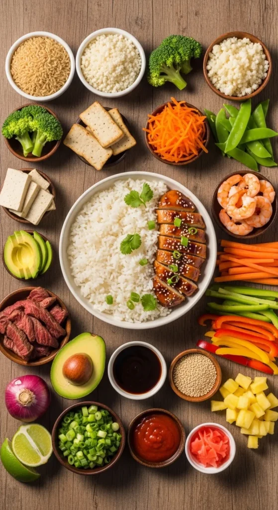 White rice is classic, brown rice is healthier, cauliflower rice = green vibes. Pick your adventure.