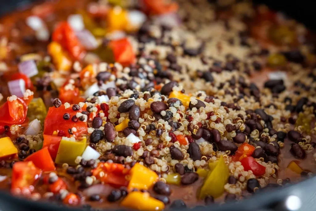 Rinse quinoa well to remove bitterness. Stir occasionally while simmering to prevent sticking. The chili thickens as it rests, so adjust liquid if you prefer a soupier consistency.
