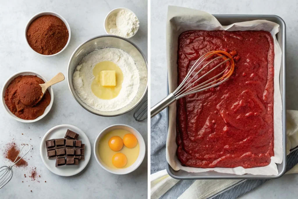 Begin by preheating your oven to 350°F and lining an 8×8 baking pan with parchment paper so the brownies lift out easily after baking. In a large bowl, whisk together the melted butter and sugar until well combined, then add the eggs and vanilla and continue whisking until the mixture becomes smooth and glossy. Stir in the red food coloring until you achieve a vibrant shade of red. Add the cocoa powder, flour, baking powder, and salt, gently folding until a thick, even batter forms. Spread the batter into your prepared pan and smooth the top. Bake for 25–30 minutes, or until the edges are set and the center no longer jiggles. Allow the brownies to cool completely before slicing so they hold their shape and stay fudgy.