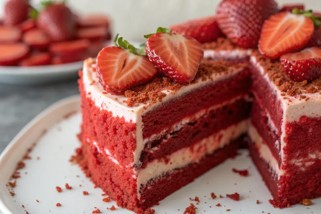 Every great recipe starts with quality ingredients. This cake uses simple pantry staples like flour, sugar, cocoa, and eggs, paired with cream cheese and strawberries to elevate the flavors. Each ingredient plays a role in creating that iconic velvety texture and stunning presentation.