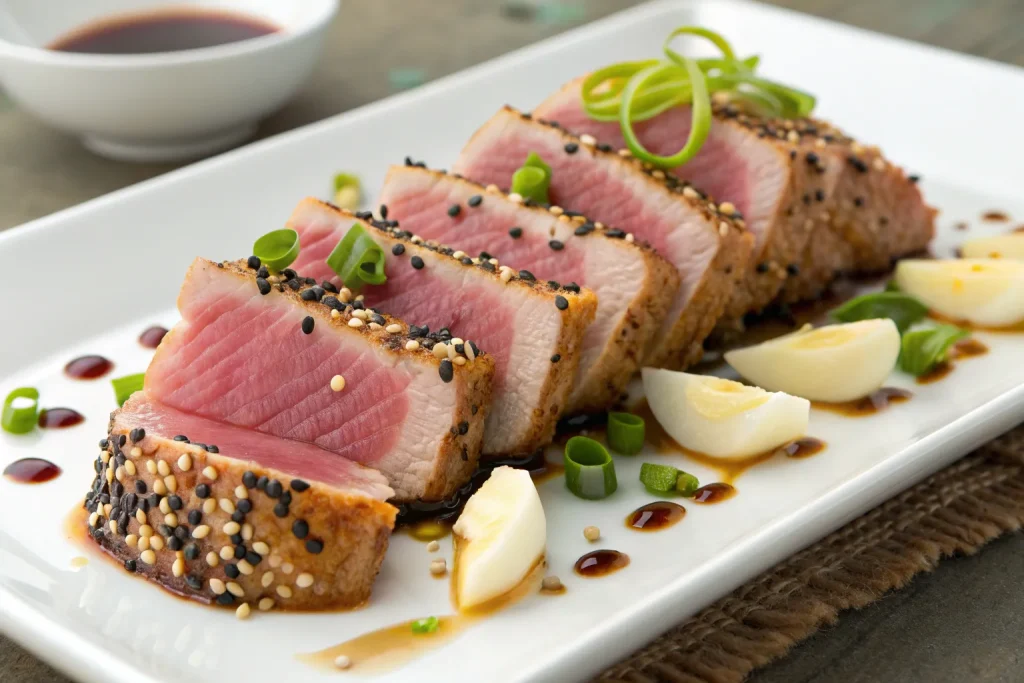 5. Garnish & Serve – Slice tuna against the grain, sprinkle with sesame seeds and green onions, and serve with lime wedges.