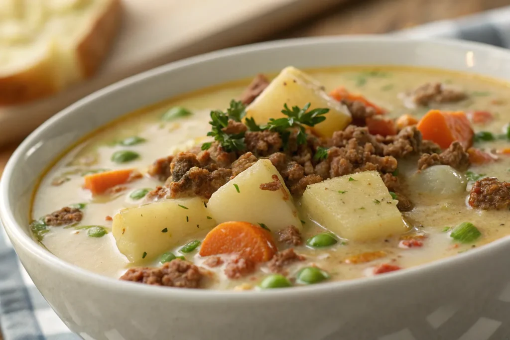 The soup is high in protein from ground meat and provides essential vitamins from vegetables like carrots, peas, and corn. Using lean meat or turkey can reduce fat, while mashed potatoes add filling carbohydrates. It is both hearty and balanced, making it suitable as a full meal.