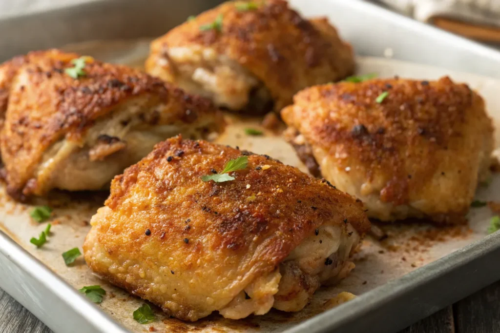 Begin by preheating the oven and lining a baking sheet or roasting pan. Pat the chicken thighs completely dry with paper towels, which is essential for crispy skin. Lightly coat the chicken with oil or spray, then season evenly on all sides. Arrange the thighs skin-side up and bake until the skin is golden and crispy and the internal temperature reaches doneness. Allow the chicken to rest briefly before serving so the juices redistribute.