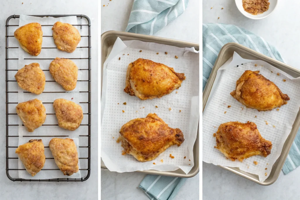 You can swap olive oil with avocado oil or cooking spray. Boneless thighs can be used, but they may cook faster and won’t get quite as crispy. Spice blends can be adjusted with smoked paprika, chili powder, or Italian seasoning to suit your taste.