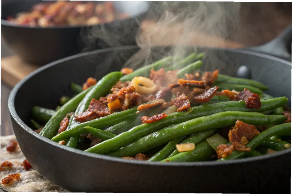 - Cook the Green Beans: Add green beans to the skillet and toss in the bacon drippings. Sauté for 5–7 minutes until slightly tender.