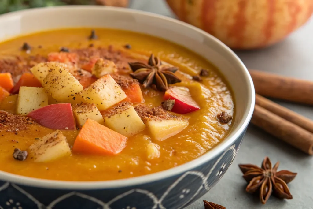 Carrot and apple soups are a classic in European cuisine, often served in autumn and winter to highlight seasonal produce. Spices like cinnamon and nutmeg were historically used to add warmth and flavor, reflecting the culinary traditions of cozy, home-cooked meals.