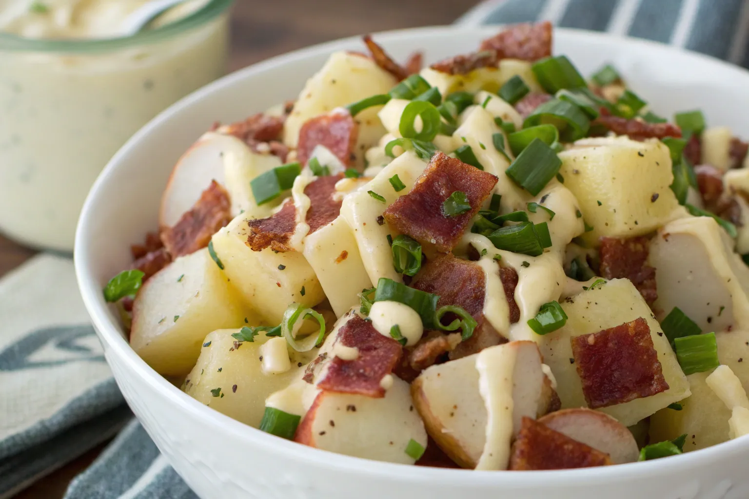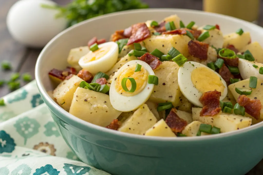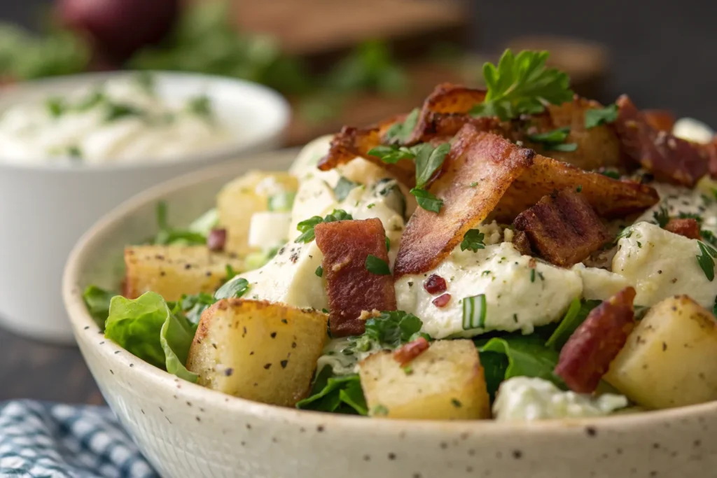 This potato salad is rich in protein and healthy fats from bacon and eggs (if included in the dressing) and provides complex carbohydrates from potatoes. While indulgent, portion control helps balance calorie intake. Using lighter dressings or Greek yogurt instead of mayonnaise can reduce fat content without sacrificing creaminess. Fresh herbs add micronutrients and enhance flavor naturally.