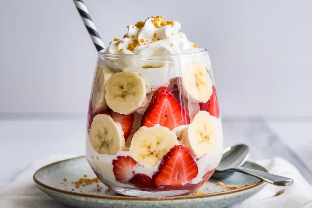 This dessert offers a mix of fresh fruit and creamy elements, providing vitamins from the strawberries and bananas alongside calcium from the pudding. While it is a sweet treat, you can lighten it by using low-fat milk, reduced-sugar pudding mix, or coconut whipped cream if preferred. Its fruit content makes it more nutrient-dense than typical heavy desserts.