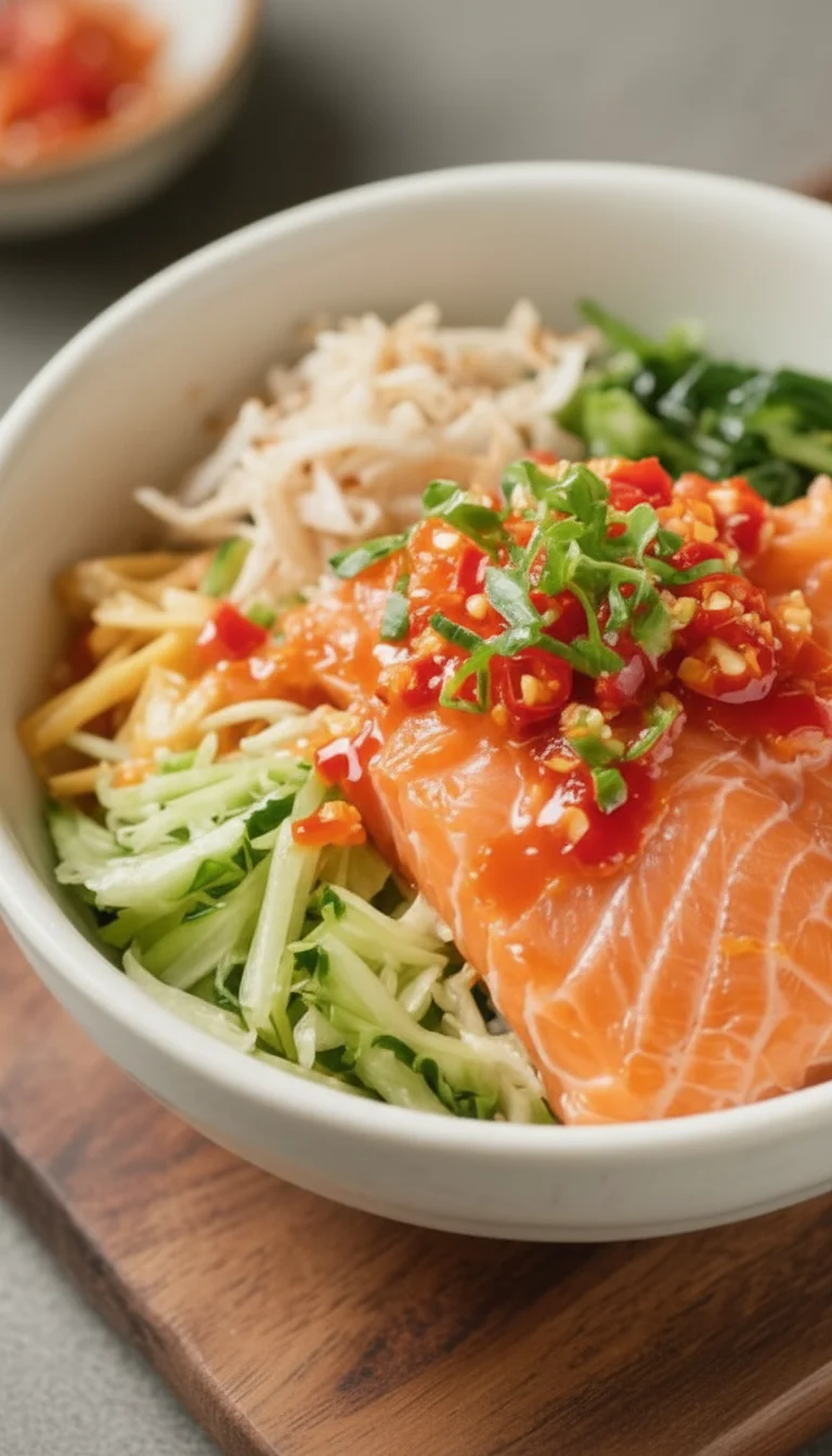 This Thai sweet chili salmon bowl is the kind of dinner that feels special but takes less than 30 minutes. It’s sticky, slightly spicy, and perfectly balanced with fresh veggies and fluffy rice. The sauce caramelizes around the salmon, giving you golden edges and a glossy finish.