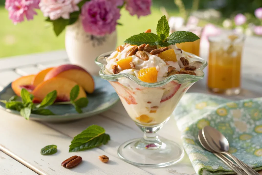 Even simple recipes come with a few pitfalls. Using underripe peaches will result in a salad that lacks sweetness and juiciness. Overmixing the cream base can break down the fruit, leaving the dish watery. And while marshmallows add charm, too many can overpower the natural flavors. Keeping these mistakes in mind ensures that your salad turns out light, creamy, and perfectly balanced every time.