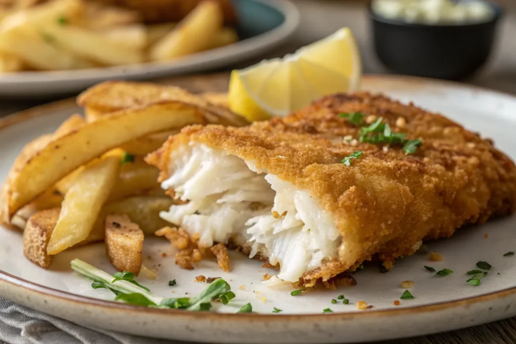This pub-style dish uses cod fillets, all-purpose flour, baking powder, salt, pepper, and cold beer for the batter, along with oil for frying. To prepare, whisk flour, baking powder, and seasoning, then slowly stir in cold beer until a smooth, light batter forms. Heat oil in a deep pan until hot. Dip the cod fillets into the batter, letting excess drip off, and carefully lower them into the oil. Fry until golden and crisp on the outside and flaky inside. Serve immediately with tartar sauce, fries, and lemon wedges.