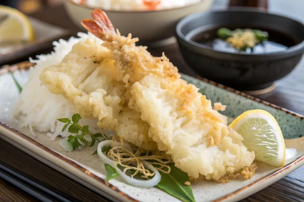 Tempura-style cod is made with cod fillets, tempura batter mix or flour, cornstarch, ice-cold water, and oil for frying. Prepare a light batter using cold water to keep it airy. Dip thin cod slices into the batter and fry quickly in hot oil until pale golden and crisp. Drain briefly and serve with soy sauce or a light dipping sauce.