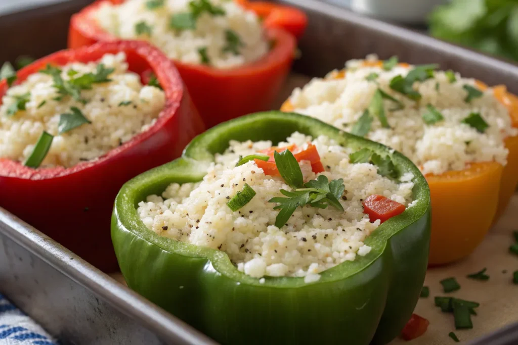 Replace rice with cauliflower rice for a low-carb twist on stuffed peppers. Fill with ground meat, cheese, and spices for a colorful, nutritious meal.